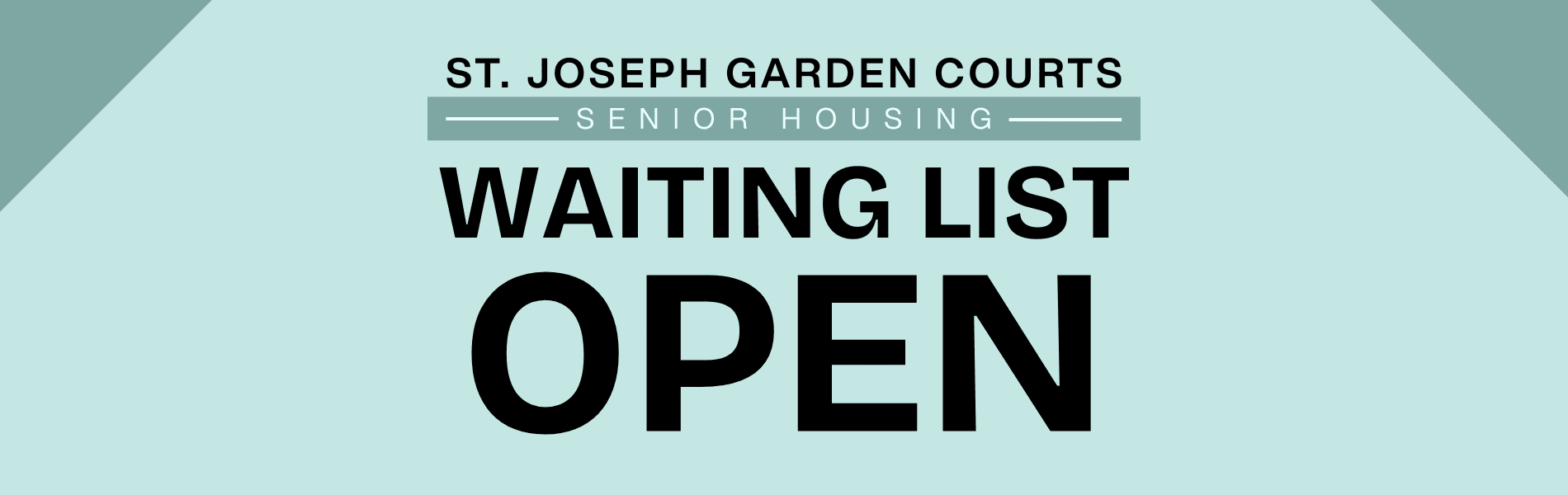 Date Posted: 09.16.2025 St. Joseph Garden Courts Waiting List Open Our Housing Ministry strives to provide strong, sustainable, and stable affordable housing. Information Senior Housing - 62 and Older 1 Bedroom and 1 Bathroom Affordable Subsidized (Pay rent according to your income) Convenient Location - Waterford Lakes (Close to shopping, dining, etc.) Service Coordinator and Activities Professional Management Applications will only be accepted during the… Read More >