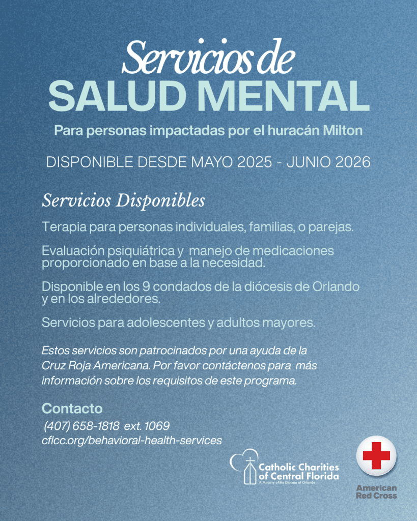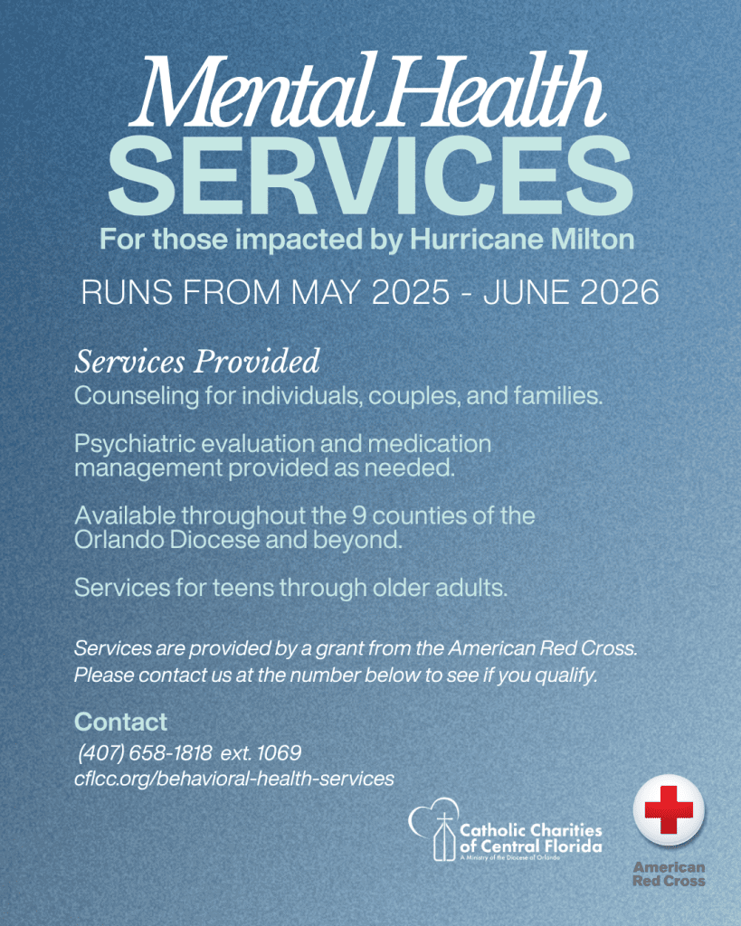 Behavioral Health at Catholic Charities is a full-service outpatient mental health program that provides outpatient therapy, psychiatric evaluations, medication management as well as care coordination services that wrap around clients for improved healing and change.  Whether it is in-person or virtual, we have the capacity through our extensive network to meet people in ways most convenient for them. These services are offered throughout the nine counties of Diocese of Orlando.
