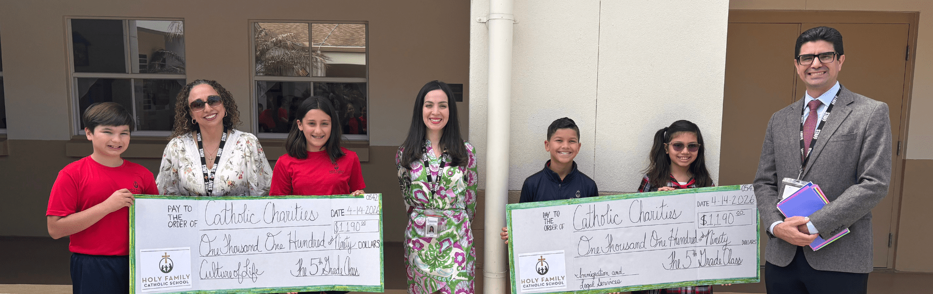 ORLANDO | Inspired by the witness of St. Monica and St. Thomas More, fifth‑grade students from Holy Family Catholic School in Orlando raised $2,380 for Culture of Life and Immigration Legal Services ministries of Catholic Charities of Central Florida (CCCF). Earlier this year, Leidy Rivas, director of the Culture of Life Office for CCCF, was invited to speak to the students. She shared the call to “build a culture that honors the dignity and sacredness of every human life” that is highlighted in the U.S. bishops’ nationwide initiative, Walking with Moms in Need that supports pregnant and parenting mothers. Through the Culture of Life Ministry, “our hope is for every parish to be a welcoming and loving place where mothers can find friendship, support, and hope,” Rivas said. Students found Rivas’ presentation relatable because many of them have younger siblings. “It hurt me to hear that some moms didn’t even have a clean diaper to change their baby into,” said Holy Family student Sofia A. “I heard that people need help with their babies, and I have a baby brother, so I know what that feels like,” added Maximus B. Students at Holy Family Catholic School present checks to the Culture of Life and Immigration Legal Services ministries on Apr. 14, 2026, in Orlando. (COURTESY) Rivas invited students to make a tangible expression of their faith, by offering monetary donations to help purchase diapers and writing cards for the families. “In doing so, they shared words of hope and encouragement inspired by the example of St. Monica, whose life was marked by persevering in prayer, patience, deep faith, humility, and steadfast maternal love,” Rivas said. Therese Cibotti, campus minister at the school, said this was the first time each class at Holy Family chose a patron saint. There are more than 60 fifth-graders, divided into two sections taught by Dia Rutter and Mary Favo. St. Monica is the patron saint for Rutter’s class, while St. Thomas More is the patron of Favo’s class. Raul Pinzon, supervising attorney for CCCF Immigration Legal Services (ILS,) also gave a presentation to students sharing how the ILS ministry reflects virtues modeled by St. Thomas More. ILS provides low-cost legal representation primarily to low-income and indigent foreign-born individuals and their families. Pinzon talked about integrity and compassion, two virtues that guide how attorneys should treat and represent their clients. His goal was to share with the students “how our ILS team-members navigate complex processes, with care and compassion, to help families.” “The students were completely immersed in the presentation,” Pinzon said. “It was inspiring to witness their love for learning and how conscientious they were about life experiences in general. Their questions and comments gave me a new perspective on the work we do.” “All people should feel safe, whether raising your family or moving to America,” said fifth-grader Josephina B. Cibotti estimates approximately 60% of the student body are first- or second-generation immigrants, so many students had their own experience with the complicated process of legal immigration. “My parents immigrated here and they needed help, and Mr. Raul helps a lot of people,” said Maia S. The teachers organized a “coin war” between the two homerooms during Lent to raise money for the two ministries related to their saints. Coins placed in their homeroom jar counted towards their homeroom total, while cash or dollar bills that were brought in were put in the opposing homeroom’s jar and counted against their homeroom total. Students donated their birthday money, allowance and money typically spent on extracurricular activities. Cibotti noticed the students “were just so excited that they knew exactly where that money was going” which fueled their almsgiving. They also wrote cards and prayers for the clients and staff of both ministries. “It felt good to take time out of my day to tell someone they would be okay,” Ivanna O. said. On April 14, the students surprised Rivas and Pinzon and presented each of them with a check for $1,190. Pinzon is grateful for the students’ support. “Their generosity was profoundly powerful and breathtaking. It will help many families who have experienced great struggles, and it concretely shows that God is always there,” he said. For Rivas, the students’ gift was meaningful. “It was deeply moving to witness their joy and enthusiasm in serving others, and truly inspiring to see these young students so eager to live out their faith in action.”